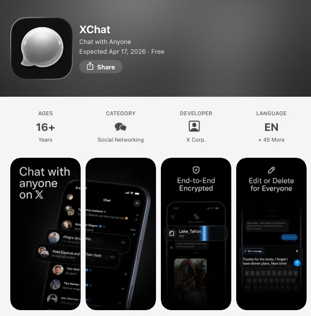 11일(현지시간) 애플 앱스토어에 따르면 메시지앱 'X챗'은 오는 17일 출시할 예정이다.
