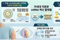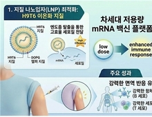 한국생명공학연구원은 적은 용량으로 높은 면역 반응을 유도할 수 있는 차세대 메신저 리보핵산(mRNA) 백신 플랫폼 설계 방법을 개발했다고 4일 밝혔다. 핵산치료제연구센터 차현주 박사 연구팀은 mRNA를 몸속 세포에 잘 전달해 주는 지질 나노입자와 mRNA가 더 잘 작동하도록 돕는 유전 설계 구조를 동시에 개선했다. mRNA는 DNA 유전 정보를 세포로 전달해 단백질 생성을 지시하는 물질로, 몸속에서 쉽게 분해되고 세포막을 스스로 통과하기 어렵기 때문에 이를 안전하게 감싸 보호하며 세포 안까지 운반해 줄 나노입자 기술이 필수적이다. 연구팀은 96종의 후보 물질을 비교한 결과, 'H9T6'라는 새로운 물질이 기존에 사용되던 물질보다 세포 안으로 mRNA를 더 잘 전달하는 것을 확인했다. 이 입자는 세포 안으로 들어간 뒤 mRNA가 작은 주머니 같은 공간(엔도좀)에 갇혀 분해되기 전 단백질을 만드는 곳으로 잘 빠져나오도록 도와 면역 단백질 생성이 늘어나는 것으로 나타났다. mRNA에는 단백질을 얼마나 많이, 얼마나 오랫동안 만들지를 결정하는 앞뒤 조절 구간(UTR)이 있는데, 연구팀은 수십만개 후보를 분석해 가장 효과적인 구조를 찾아 단백질 생성 능력을 크게 높였